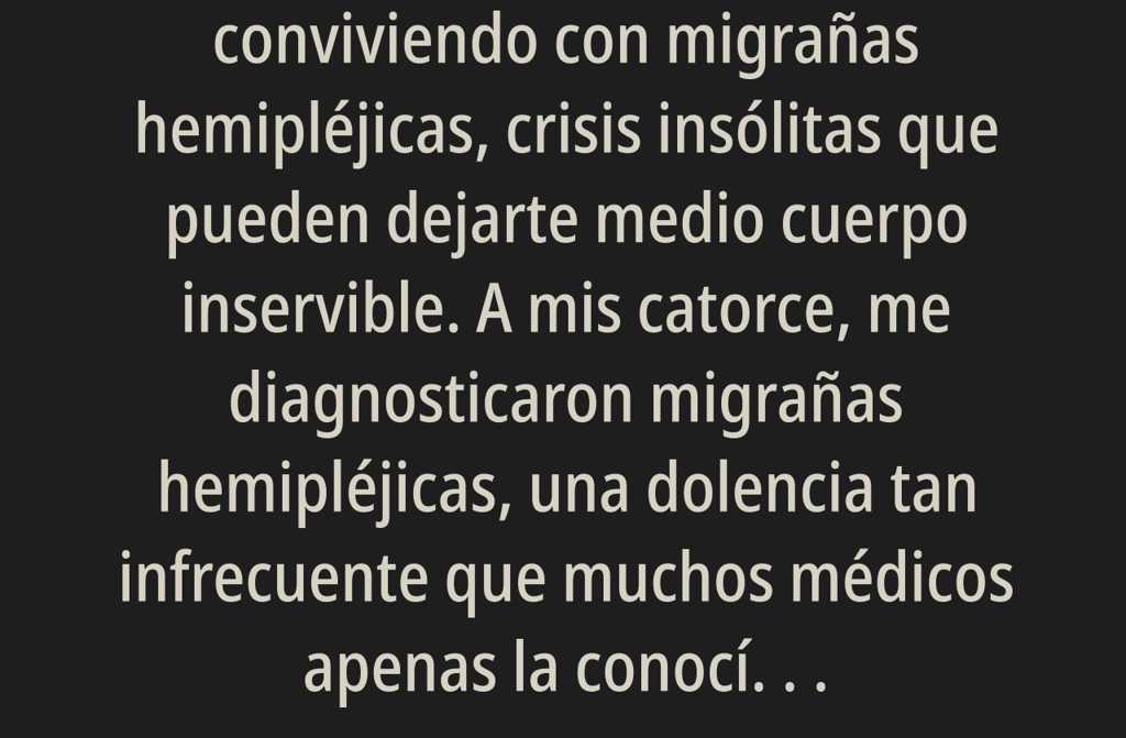 A los catorce años ya estaba enfrentándome a las migrañas hemipléjicas, esos episodios tan extraños que podían dejar medio cuerpo inservible.