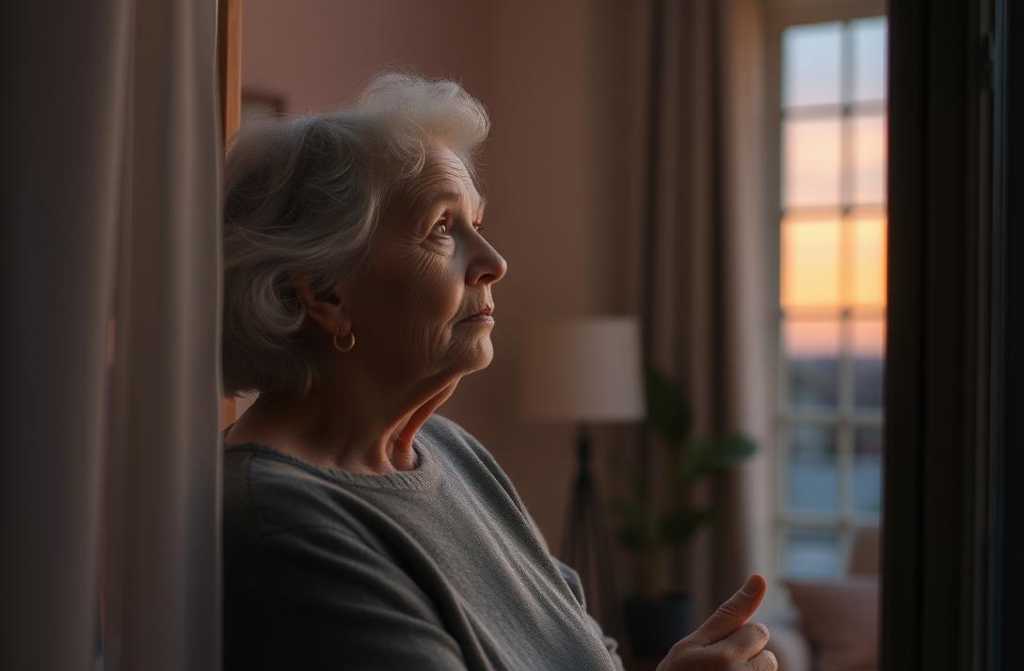 Lucía mira por la ventana, donde comienza a caer la tarde.