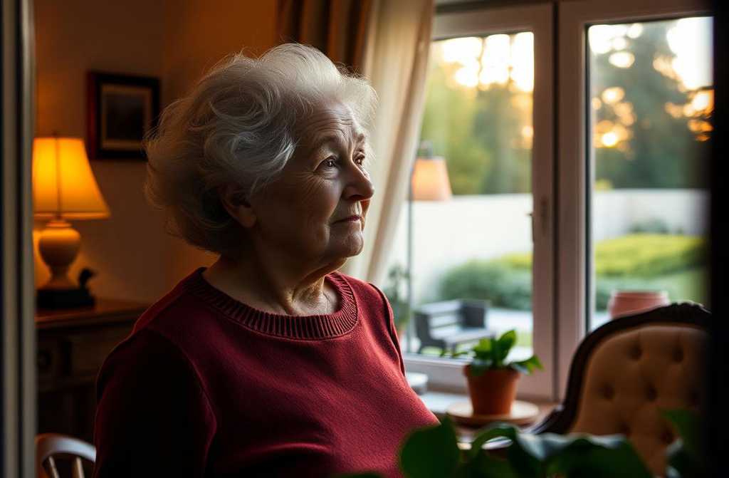 Adela mira por la ventana, donde comienza a caer la tarde.