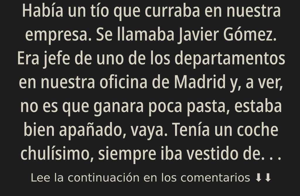 Había un tío que curraba en nuestra empresa. Se llamaba Javier Gómez. Era jefe de uno de los departamentos en nuestra oficina de Madrid y, a ver, no es que ganara poca pasta, estaba bien apañado, vaya. Tenía un coche chulísimo, siempre iba vestido de punta en blanco con ropa de firma y se le notaba que se cuidaba un montón. Pero tenía un problema grande: era más tacaño que un candado. Lo suyo con el dinero era de estudio, sobre todo con la comida.