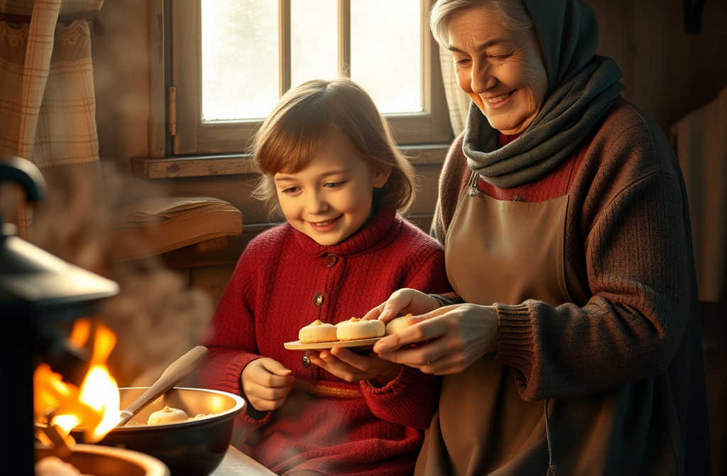 Pero lo que encontró fue calor de hogar: la chimenea encendida, el pequeño limpio y contento escuchando cuentos en el antiguo tocadiscos, mientras la anciana se movía por la cocina ágil como antaño, pincelando la bandeja de empanadas, batiendo huevos con el requesón. Esos pies cansados de repente volvían a la vida.