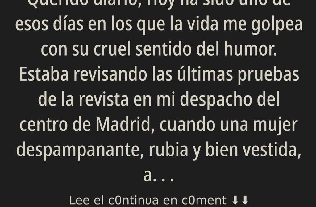 Hoy ha sido uno de esos días en los que la vida me golpea con su cruel sentido del humor. Estaba revisando las últimas pruebas de la revista en mi despacho del centro de Madrid, cuando una mujer despampanante, rubia y bien vestida, apareció en el umbral de la puerta. Sin rodeos, con una sonrisa cargada de autosuficiencia, soltó: