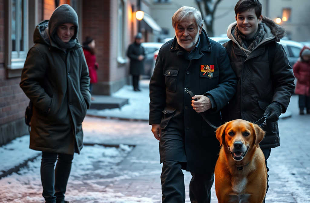 Y así, cada tarde, se ve en el barrio un trío peculiar: un hombre mayor de uniforme, un niño y un chucho viejo y rojizo.
