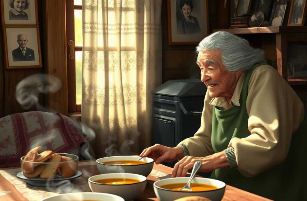 Carlota, sin pronunciar palabra, sacó de la chimenea una cazuela de barro, echó un vistazo al reloj de pared como indicando que era hora de comer, y sirvió en un cuenco profundo un abundante plato de cocido madrileño. Añadió un trozo de chorizo, una cebolla y una rebanada de pan rústico con corteza crujiente. Tras pensarlo un momento, colocó una botella de vino tinto en la mesa. Su espalda encorvada, envuelta en un chal de lana, parecía frágil, pero en sus alpargatas se movía con seguridad, a pesar del calor de la cocina.
