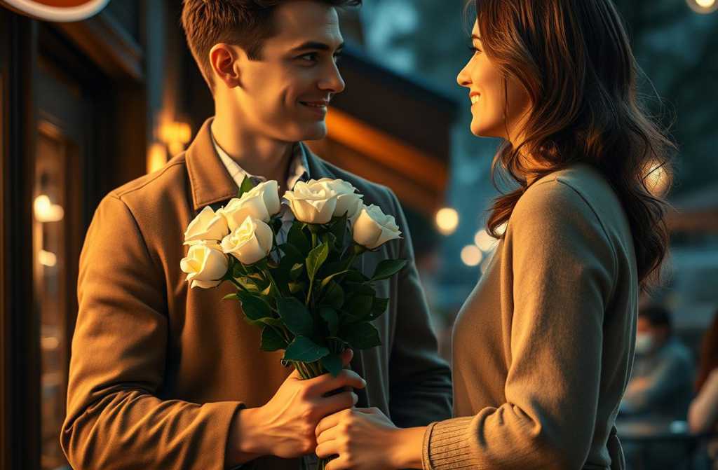 Observó a los transeúntes que se acercaban al local. Junto a la entrada estaba un joven con un ramo de rosas blancas, dando la vuelta como esperando a alguien.