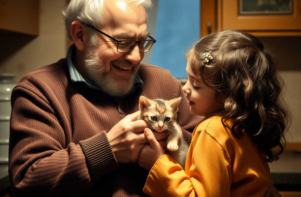 Una hora después, el gatito, llamado Niebla, estaba en el regazo de Azucena, y ella en el de su abuelo. La niña se apoyó en su pecho y sonrió alegremente: