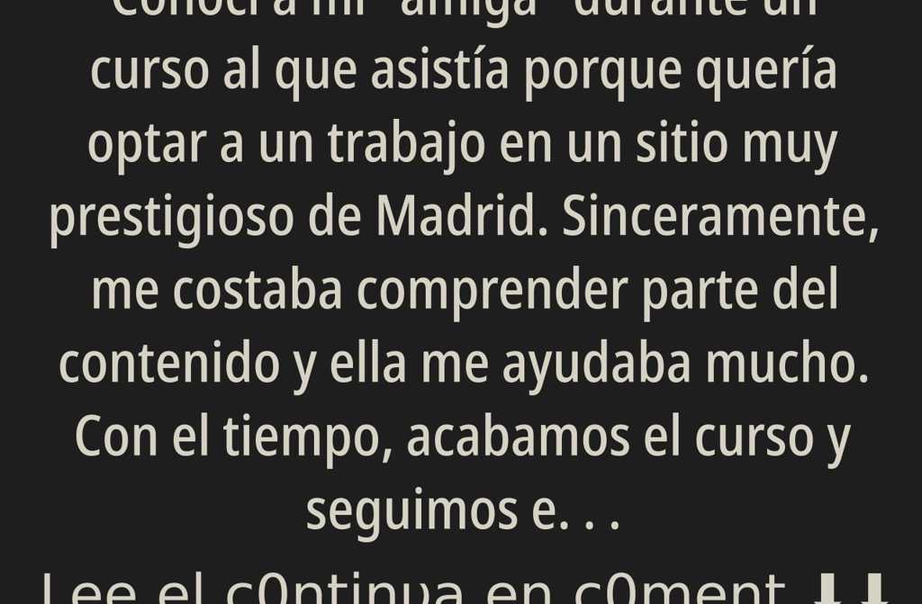 Conocí a mi “amiga” durante un curso al que asistía porque quería optar a un trabajo en un sitio muy prestigioso de Madrid. Sinceramente, me costaba comprender parte del contenido y ella me ayudaba mucho. Con el tiempo, acabamos el curso y seguimos en contacto. Ella todavía dependía económicamente de sus padres y, en cambio, yo estaba casada y no contaba con ese apoyo familiar.