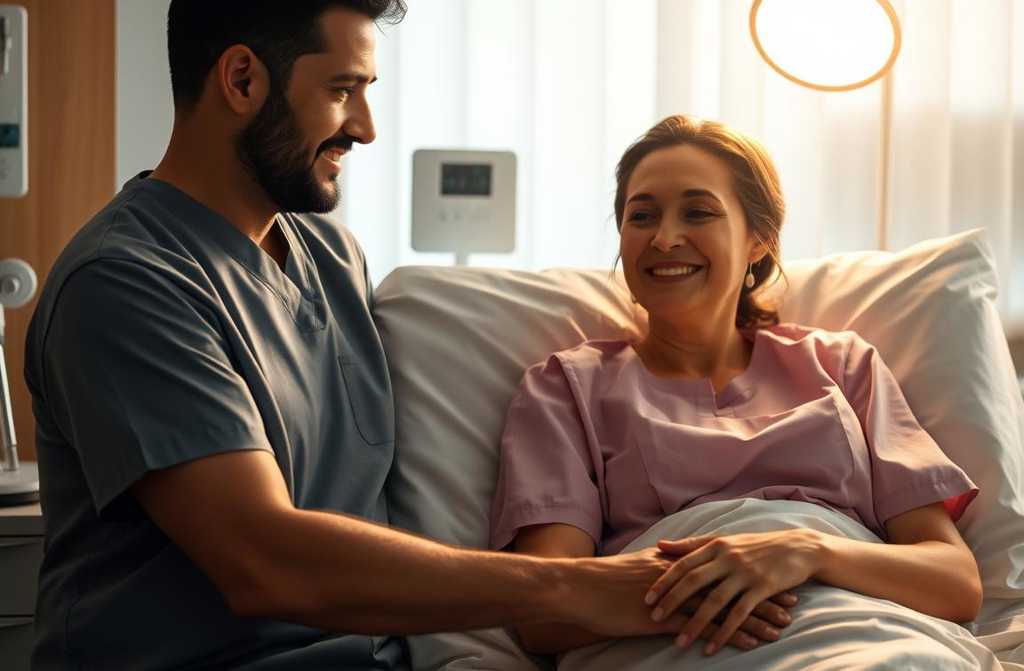 La enfermera se levanta, ajustando la vía intravenosa.