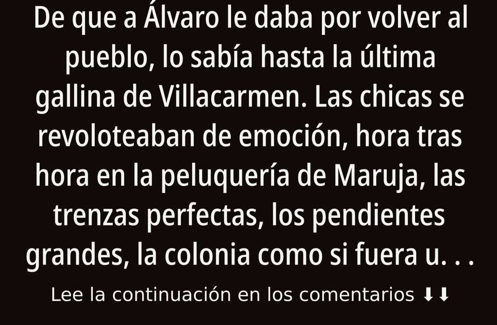 De que a Álvaro le daba por volver al pueblo, lo sabía hasta la última gallina de Villacarmen. Las chicas se revoloteaban de emoción, hora tras hora en la peluquería de Maruja, las trenzas perfectas, los pendientes grandes, la colonia como si fuera un desafío. Menos Inés, pobrecilla, que siempre fue la huérfana. ¿Para qué iba a andar complicándose la vida con esas artimañas? Ella, con su coleta apañada y la falda de siempre. Así, tal cual, fue como Álvaro se quedó prendado de ella en cuanto la vio.