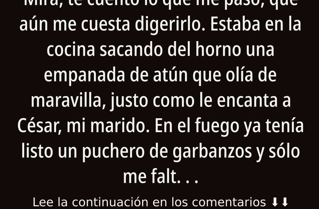 Mira, te cuento lo que me pasó, que aún me cuesta digerirlo. Estaba en la cocina sacando del horno una empanada de atún que olía de maravilla, justo como le encanta a César, mi marido. En el fuego ya tenía listo un puchero de garbanzos y sólo me faltaba acabar la compota. Siempre que él volvía de trabajar fuera, me esmeraba como si fuera el primer día: en la mesa, todo lo que le gusta. Y esta vez, no iba a ser menos.