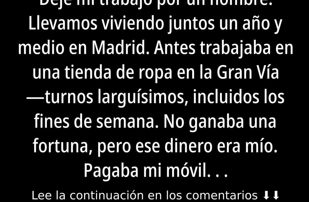 Dejé mi trabajo por un hombre. Llevamos viviendo juntos un año y medio en Madrid. Antes trabajaba en una tienda de ropa en la Gran Vía turnos larguísimos, incluidos los fines de semana. No ganaba una fortuna, pero ese dinero era mío. Pagaba mi móvil, el abono de transporte, mis cosas y aportaba en la casa. Jamás le pedí dinero para nada.