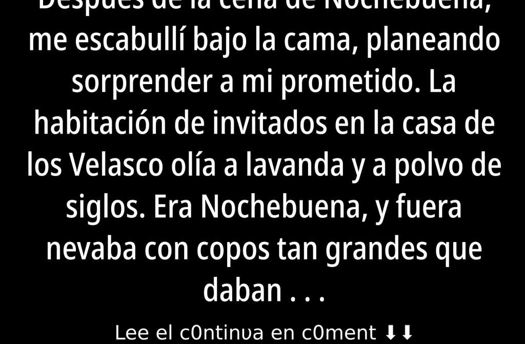 Después de la cena de Nochebuena, me escabullí bajo la cama, planeando sorprender a mi prometido. La habitación de invitados en la casa de los Velasco olía a lavanda y a polvo de siglos. Era Nochebuena, y fuera nevaba con copos tan grandes que daban para anuncio de turrón. Dentro, la casa estaba llena de calor, de olor a cordero asado y del murmullo lejano de risas.