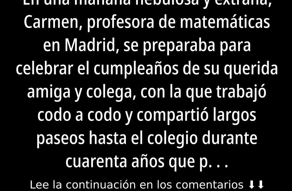 En una mañana nebulosa y extraña, Carmen, profesora de matemáticas en Madrid, se preparaba para celebrar el cumpleaños de su querida amiga y colega, con la que trabajó codo a codo y compartió largos paseos hasta el colegio durante cuarenta años que parecían fluir como agua por los adoquines. Carmen eligió despacio una camisa y una falda elegante, casi como si los colores bailaran en el espejo bajo la luz gris. Aunque la ciudad aún tenía charcos frescos de la tormenta de la noche anterior y las aceras olían a humedad, ella salió hacia una pastelería cercana, decidida a comprar un gran pastel y un ramo de claveles, esos rojos intensos que sólo florecen en Castilla.