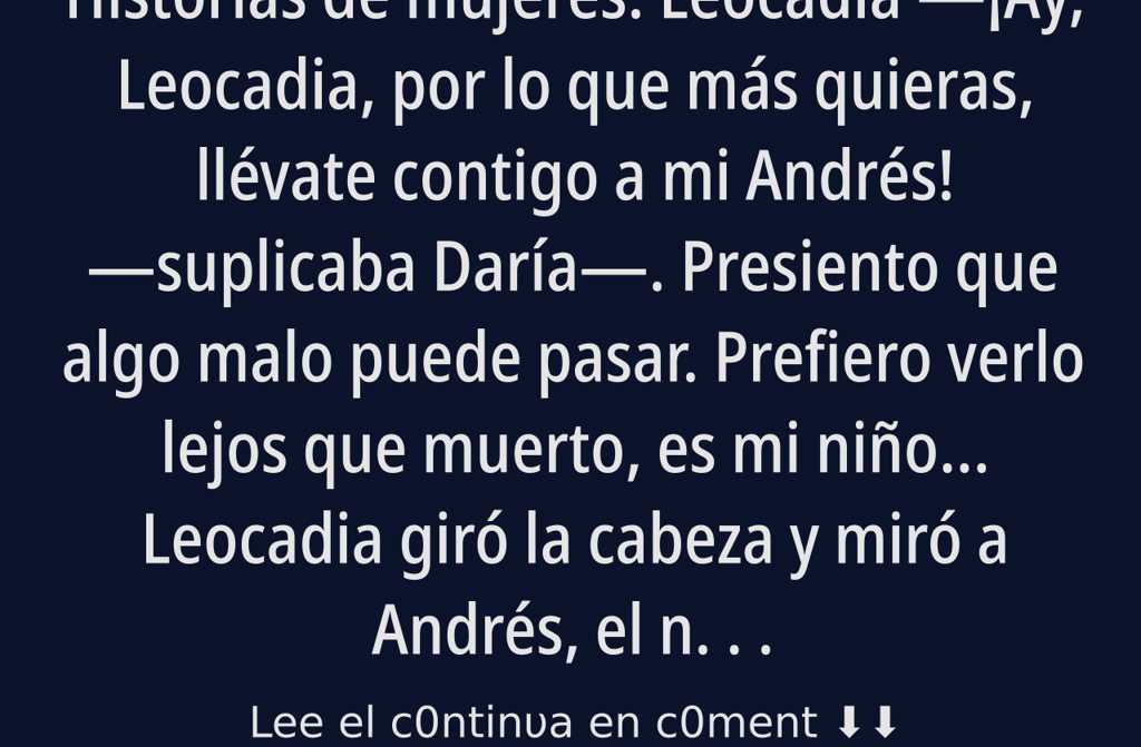 ¡Ay, Leocadia, por lo que más quieras, llévate contigo a mi Andrés! suplicaba Daría. Presiento que algo malo puede pasar. Prefiero verlo lejos que muerto, es mi niño…