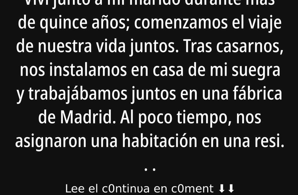 Viví junto a mi marido durante más de quince años; comenzamos el viaje de nuestra vida juntos. Tras casarnos, nos instalamos en casa de mi suegra y trabajábamos juntos en una fábrica de Madrid. Al poco tiempo, nos asignaron una habitación en una residencia de trabajadores y nos mudamos, dejando atrás la casa de mi suegra. Las cosas iban bien, y comprendí que mi marido debía sacar una carrera si quería progresar. Le animé a que se matriculara y, en realidad, era yo quien estudiaba y escribía sus trabajos, informes y exámenes.