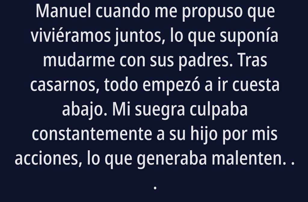 Llevaba tres años saliendo con Manuel cuando me propuso que viviéramos juntos, lo que suponía mudarme con sus padres. Tras casarnos, todo empezó a ir cuesta abajo.