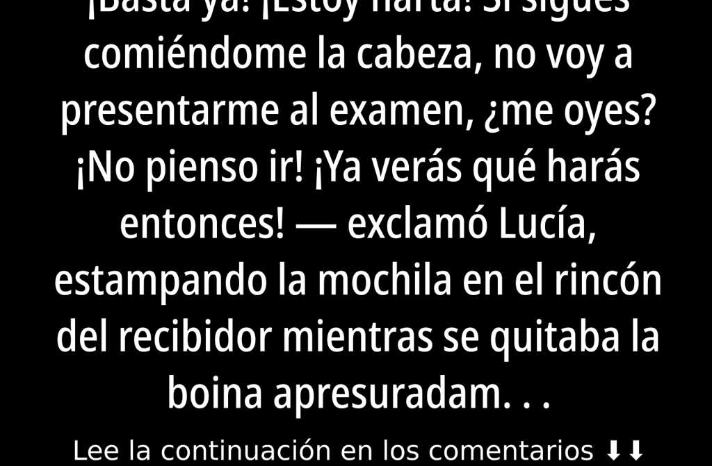 ¡Basta ya! ¡Estoy harta! Si sigues comiéndome la cabeza, no voy a presentarme al examen, ¿me oyes? ¡No pienso ir! ¡Ya verás qué harás entonces! exclamó Lucía, estampando la mochila en el rincón del recibidor mientras se quitaba la boina apresuradamente.