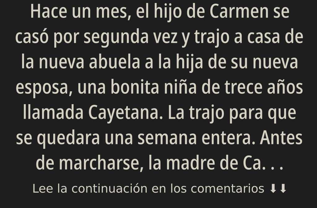 Hace un mes, el hijo de Carmen se casó por segunda vez y trajo a casa de la nueva abuela a la hija de su nueva esposa, una bonita niña de trece años llamada Cayetana. La trajo para que se quedara una semana entera.