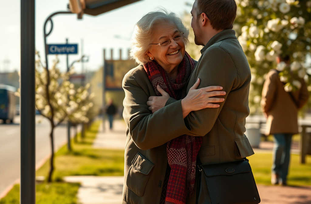 María llega a la parada del autobús, pero no sabe a dónde ir después; la vista le falla y no puede leer la dirección. Ve a un joven de pie y le pregunta: