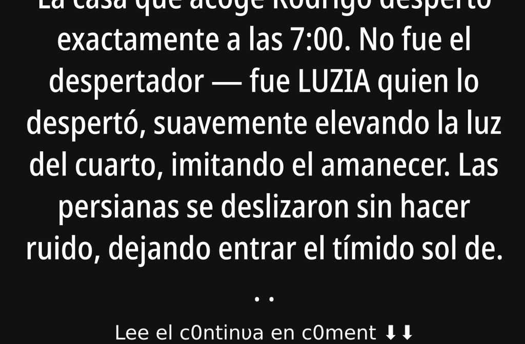 Rodrigo despertó exactamente a las 7:00. No fue el despertador fue LUZIA quien lo despertó, suavemente elevando la luz del cuarto, imitando el amanecer. Las persianas se deslizaron sin hacer ruido, dejando entrar el tímido sol de la mañana madrileña de noviembre. La temperatura pasó de dieciocho a veintidós grados, justo como le gustaba.