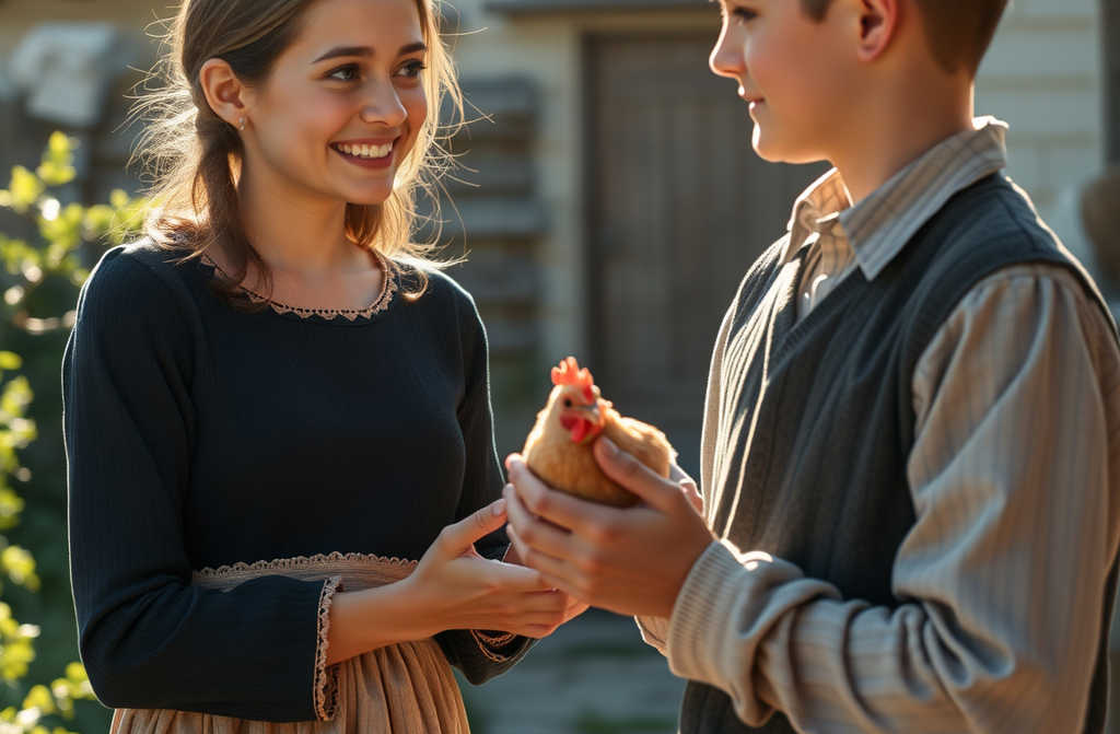 La feria rebullía de calor y vida: carpas de frutas, de miel de brezo, chales de seda y guirnaldas de almendras garrapiñadas al sol. Eulalia, sudorosa, se acercó a un puesto de abalorios, intentando ofrecer en voz baja su gallina a la vendedora. Un joven, Teo, que estaba cerca, se mostró interesado. Tomó la gallina entre las manos, la sopesó y preguntó el precio, notando la ternura de Eulalia: