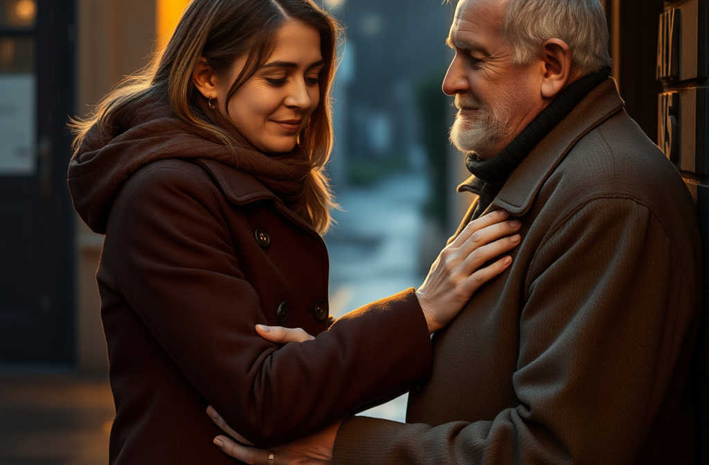 Llegamos frente a un edificio iluminado con luces cálidas. El anciano, ya sin aliento, hizo un gesto con la mano hacia la puerta de entrada. No podía moverse rápido; sus pasos eran lentos y vacilantes.