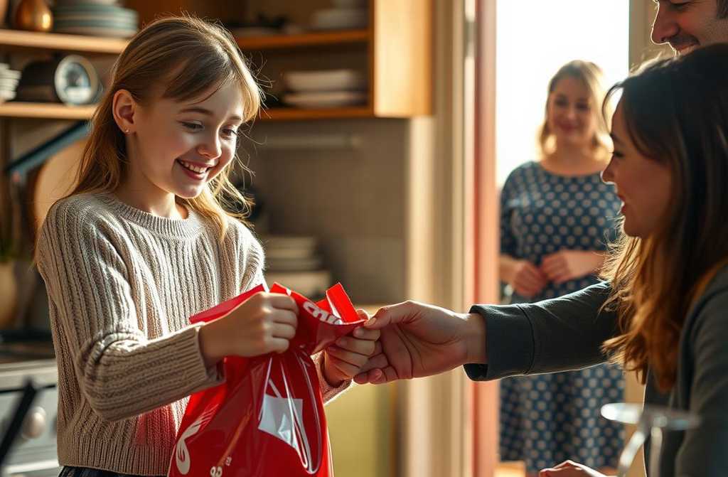 Begoña salió tímidamente, sin apartar la vista de la bolsa roja. Ramiro, al ver a su hija, sonrió exageradamente y le dijo: