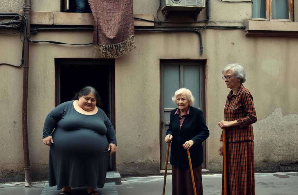En un edificio antiguo y descuidado de Madrid, una mujer regordeta sacudía una alfombra por la ventana, sin darse cuenta de que el polvo caía sobre su vecina del piso de abajo, una chica más delgada.