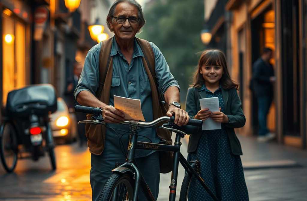 Un atardecer, bajo una llovizna fina, Mateo llegó a un edificio antiguo. Una niña lo esperaba en la puerta. Le tendió un dibujo: un sol sobre una bicicleta oxidada. La pequeña sonrió, y Mateo inclinó la cabeza. No hicieron falta palabras. Solo un instante compartido, un latido de complicidad, bastaba.