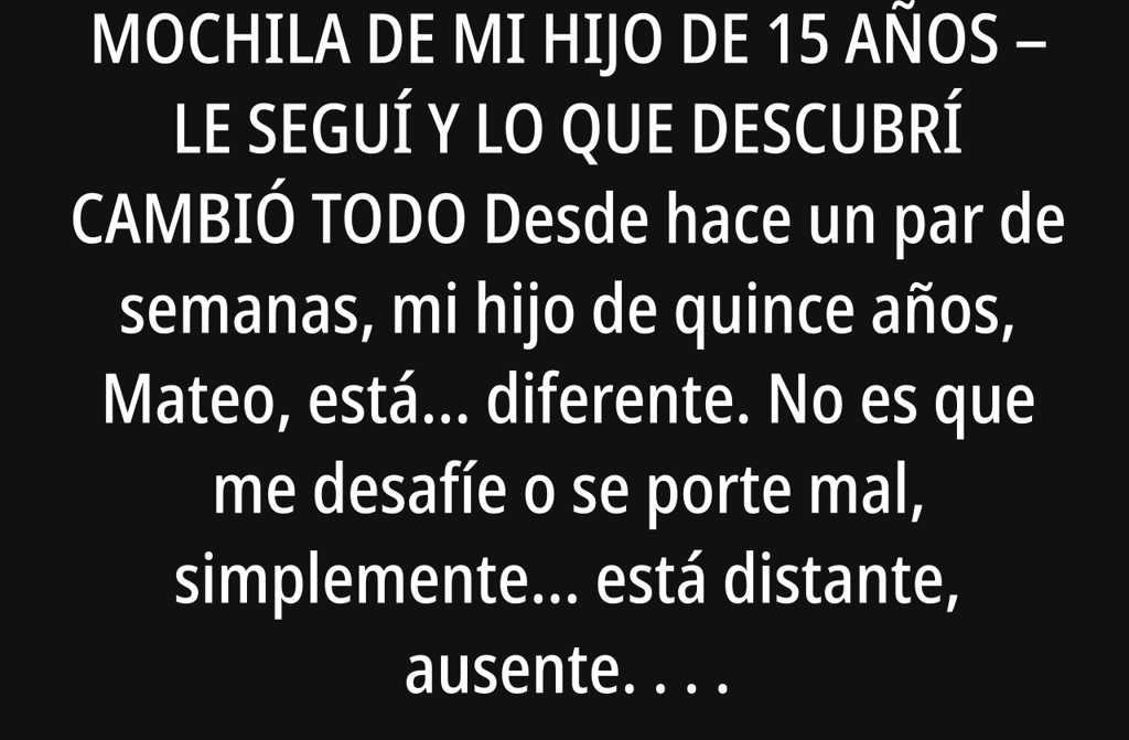 Desde hace un par de semanas, mi hijo de quince años, Mateo, está diferente. No es que me desafíe o se porte mal, simplemente está distante, ausente. Llega cansado del instituto, se encierra en su habitación sin apenas decir nada y cierra la puerta. Apenas prueba bocado y se pone nervioso cada vez que le pregunto dónde va o con quién está escribiendo. Pensé que quizá estaba enamorado o que atravesaba uno de esos dramas adolescentes tan propios de esa edad, cosas que los chavales suelen intentar resolver por sí mismos.