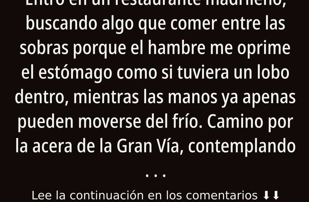 Entro en un restaurante madrileño, buscando algo que comer entre las sobras porque el hambre me oprime el estómago como si tuviera un lobo dentro, mientras las manos ya apenas pueden moverse del frío. Camino por la acera de la Gran Vía, contemplando los escaparates iluminados de tabernas y restaurantes, ese aroma a guisos recién hechos que duele tanto como la escarcha que me golpea la cara. No llevo ni un céntimo encima.