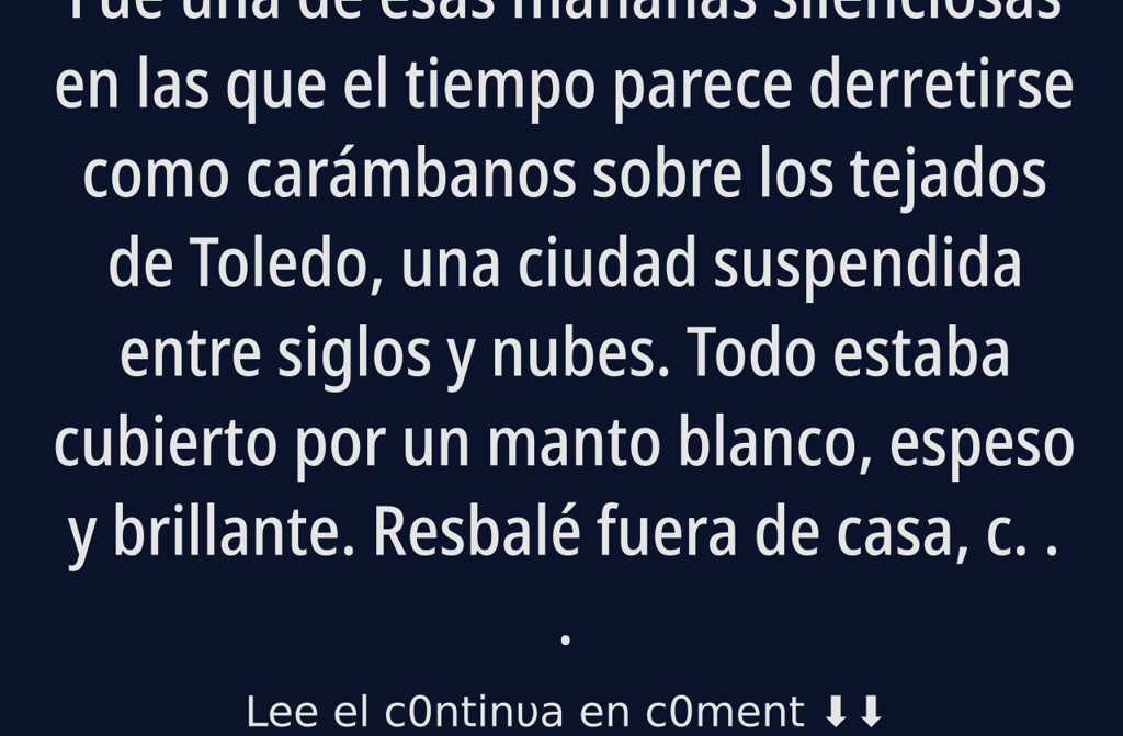 Fue una de esas mañanas silenciosas en las que el tiempo parece derretirse como carámbanos sobre los tejados de Toledo, una ciudad suspendida entre siglos y nubes. Todo estaba cubierto por un manto blanco, espeso y brillante. Resbalé fuera de casa, con la pala en la mano, pensando en la rutina de limpiar el portal, pero algo curioso distorsionó el paisaje: un coche avanzaba flotando sobre la nevada calle, envuelto en vapor como si fuera un recuerdo humedecido. Era el carteroJavier, siempre con su gorra torcida, repartiendo cartas y sonrisas como si el mundo fuera una novela de Cervantes.