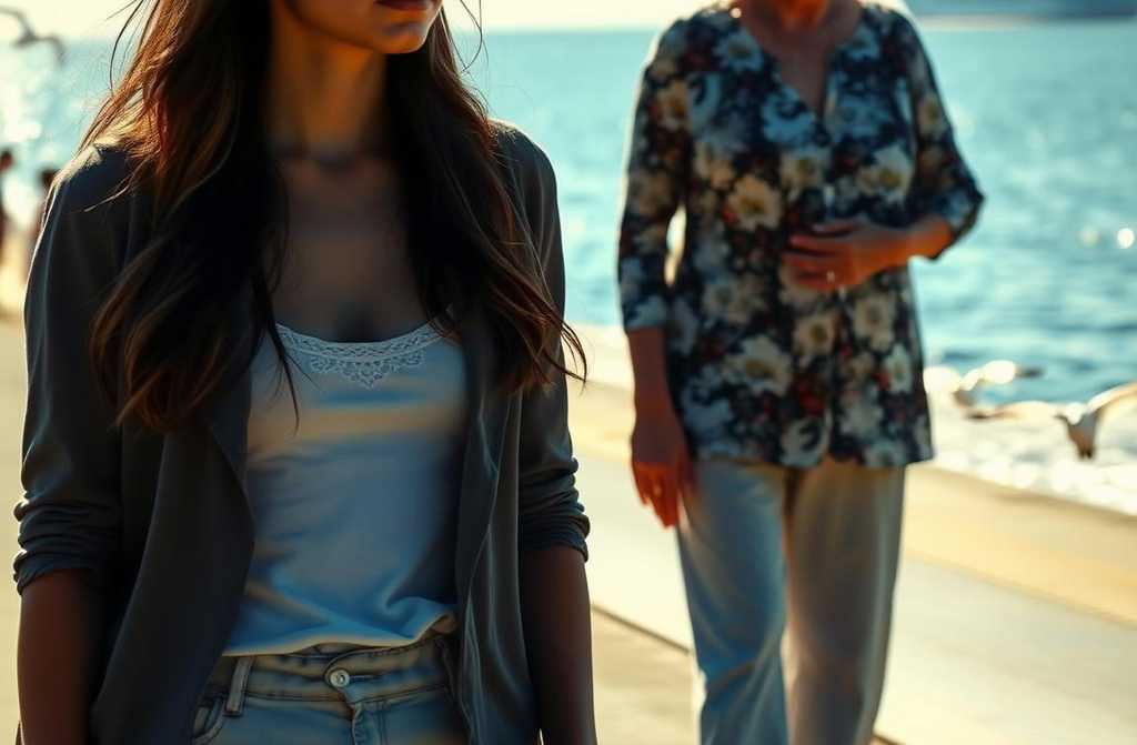 Salió y caminó hacia el mar. Desde el paseo marítimo, observó el horizonte, donde el agua se fundía con el cielo. Un barco diminuto navegaba a lo lejos. Las gaviotas gritaban.