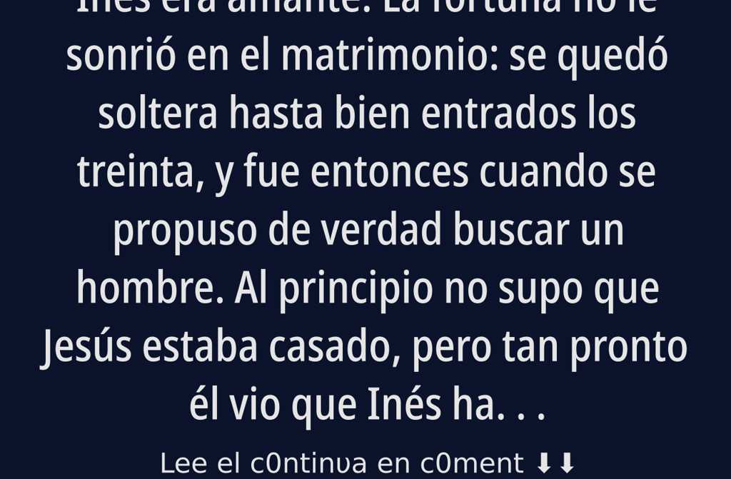 Inés era amante. La fortuna no le sonrió en el matrimonio: se quedó soltera hasta bien entrados los treinta, y fue entonces cuando se propuso de verdad buscar un hombre. Al principio no supo que Jesús estaba casado, pero tan pronto él vio que Inés había caído rendida y enamorada, dejó de ocultarlo. Sin embargo, ni un solo reproche salió de los labios de Inés. Más bien, se culpaba a sí misma por haber caído en esa relación, por su debilidad frente a él. Se sentía menos, inferior, por no haber encontrado un novio a tiempo, mientras el calendario la iba abandonando.