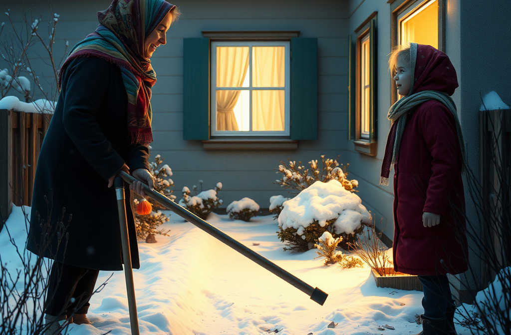 La mañana del dos de enero, se levantó temprano como siempre. Oí la puerta, miré por la ventana: estaba fuera, con la pala de quitar nieve. Iba con su abrigo antiguo y un pañuelo atado a la cabeza, despejando cuidadosamente el sendero del portón hasta la puerta. Amontonaba la nieve contra la pared de la casa, como le gustaba.