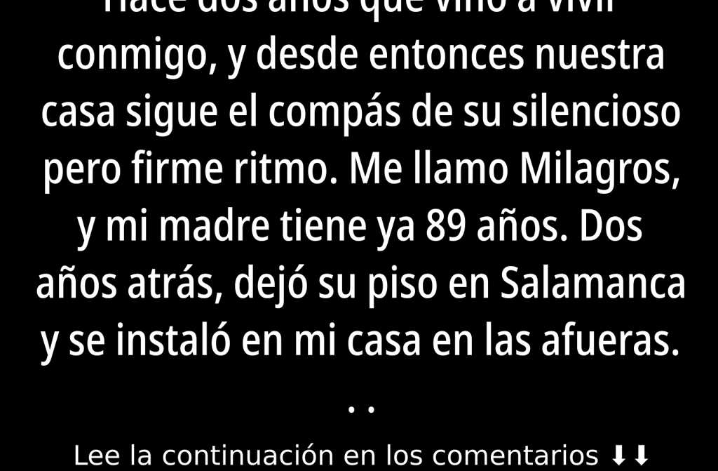 Me llamo Milagros, y mi madre tiene ya 89 años. Dos años atrás, dejó su piso en Salamanca y se instaló en mi casa en las afueras de Madrid. Desde ese día, el latir de nuestro hogar lo marca ella, tranquila y metódica. Cuando amanece, exactamente a las siete y media, escucho el sonido leve de su cama y cómo, con infinita ternura, le murmura palabras suaves a nuestro viejo gato Rufián, que lleva más de veinte años acompañándonos. Lo mima y le sirve el desayuno como si aún fuera un cachorro recién llegado.