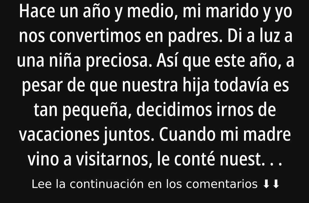 Hace un año y medio, mi marido y yo nos convertimos en padres. Di a luz a una niña preciosa. Así que este año, a pesar de que nuestra hija todavía es tan pequeña, decidimos irnos de vacaciones juntos. Cuando mi madre vino a visitarnos, le conté nuestros planes.