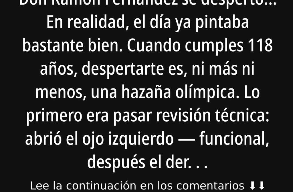 A dormir se fue Don Ramón cerca de medianoche, cuando la mayoría de asistentes ya se habían marchado: unos a casa, otros directamente al hospital de urgencias. Sonriendo a la nada, sacó del dedo y puso bajo la almohada un anillo de oro mágico que, durante décadas, había prolongado su vida. En él se leía, minúsculo y gastado, un mensaje encargado por su esposa antes de irse: Vive por los dos.