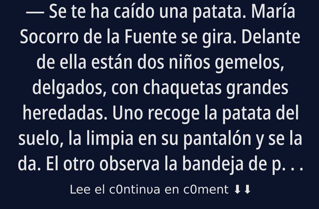 María Socorro ya no vende patatas. Vive en una casita vieja a las afueras del pueblo, haciendo malabares para sobrevivir. Piensa mucho en aquellos chicos. ¿Vivirán? ¿Se reencontrarían? A veces sueña con ellos, comiendo patatas en su puesto, acariciándoles el pelo.
