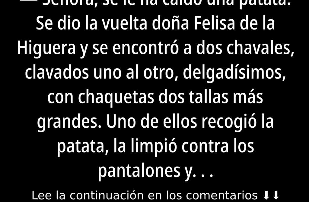 Se dio la vuelta doña Felisa de la Higuera y se encontró a dos chavales, clavados uno al otro, delgadísimos, con chaquetas dos tallas más grandes. Uno de ellos recogió la patata, la limpió contra los pantalones y se la tendió. El otro no apartaba la vista de la bandeja de patatas cocidas, como si llevara días sin comer.