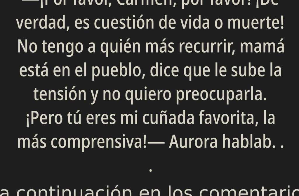 ¡Por favor, Carmen, por favor! ¡De verdad, es cuestión de vida o muerte! No tengo a quién más recurrir, mamá está en el pueblo, dice que le sube la tensión y no quiero preocuparla. ¡Pero tú eres mi cuñada favorita, la más comprensiva! Aurora hablaba tan rápido, que las palabras parecían un río fuera de control. Carmen lograba entender apenas algunas frases sobre un asunto urgente, solo hasta la tarde y sálvame, por favor.