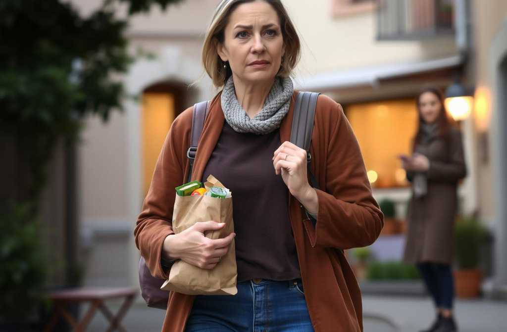 Las bolsas cayeron al suelo, esparciendo la compra. El brick de leche reventó, manchando los escalones.