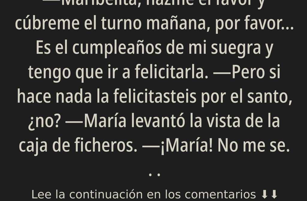 Maribelita, hazme el favor y cúbreme el turno mañana, por favor… Es el cumpleaños de mi suegra y tengo que ir a felicitarla.