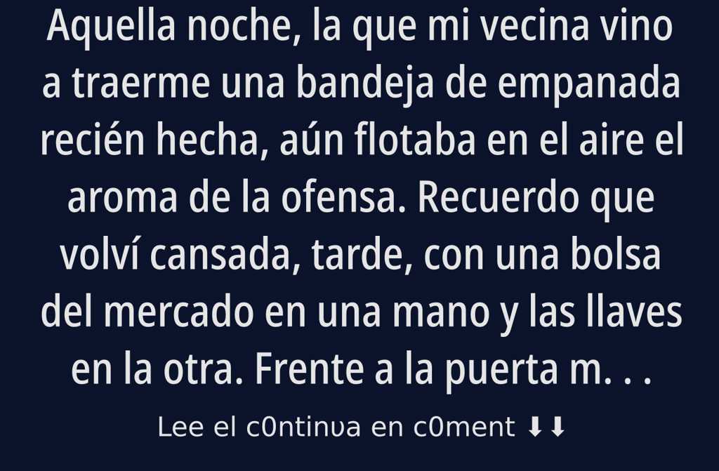 Aquella noche, la que mi vecina vino a traerme una bandeja de empanada recién hecha, aún flotaba en el aire el aroma de la ofensa.