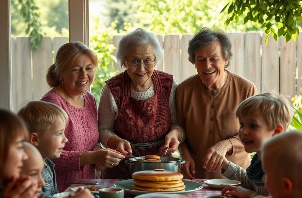Al día siguiente era sábado. Inés despertó con el perfume irresistible de la cocina. Al bajar a la terraza, vio en la mesa una impresionante torre de crepes delicados. Maruja, muy habilidosa, manejaba la sartén con destreza, sirviendo a los tres varones famélicos. Cuando vio a Inés, abuela Maruja se disculpó: