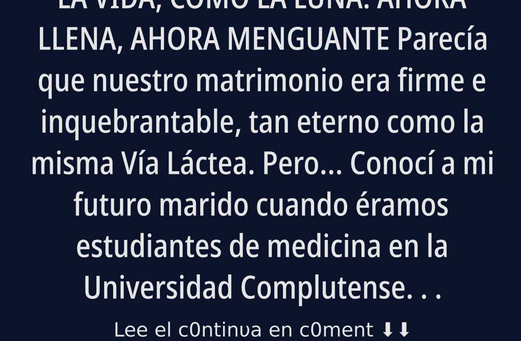 Mis hijos se fueron alejando; el hilo del afecto se tensó y se rompió. Quise esconderme para siempre en mi covacha fría. Mi abuela decía: La vida, como la luna: unas veces llena, otras, menguante. Entonces sentí que esto no podía durar mucho. O acabaría loca o haría algo sin sentido. Había dejado de saborear la existencia. Pero también era licenciada en medicina, con matrícula de honor.