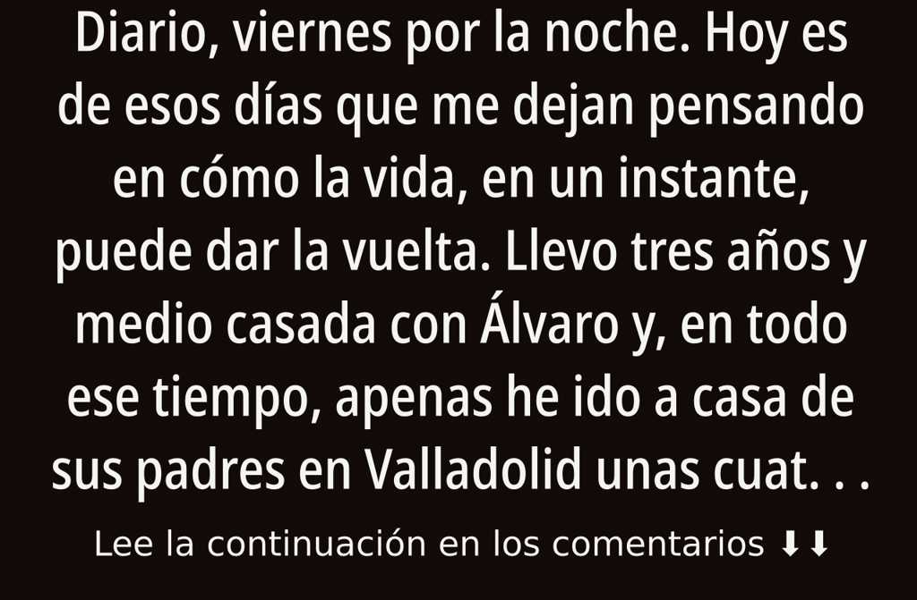 Hoy es de esos días que me dejan pensando en cómo la vida, en un instante, puede dar la vuelta. Llevo tres años y medio casada con Álvaro y, en todo ese tiempo, apenas he ido a casa de sus padres en Valladolid unas cuatro veces, y siempre por Navidad, cumpleaños o algún otro compromiso familiar de los importantes. Siguiendo la costumbre, pasábamos un rato y luego volvíamos a Madrid, a nuestra zona de confort.