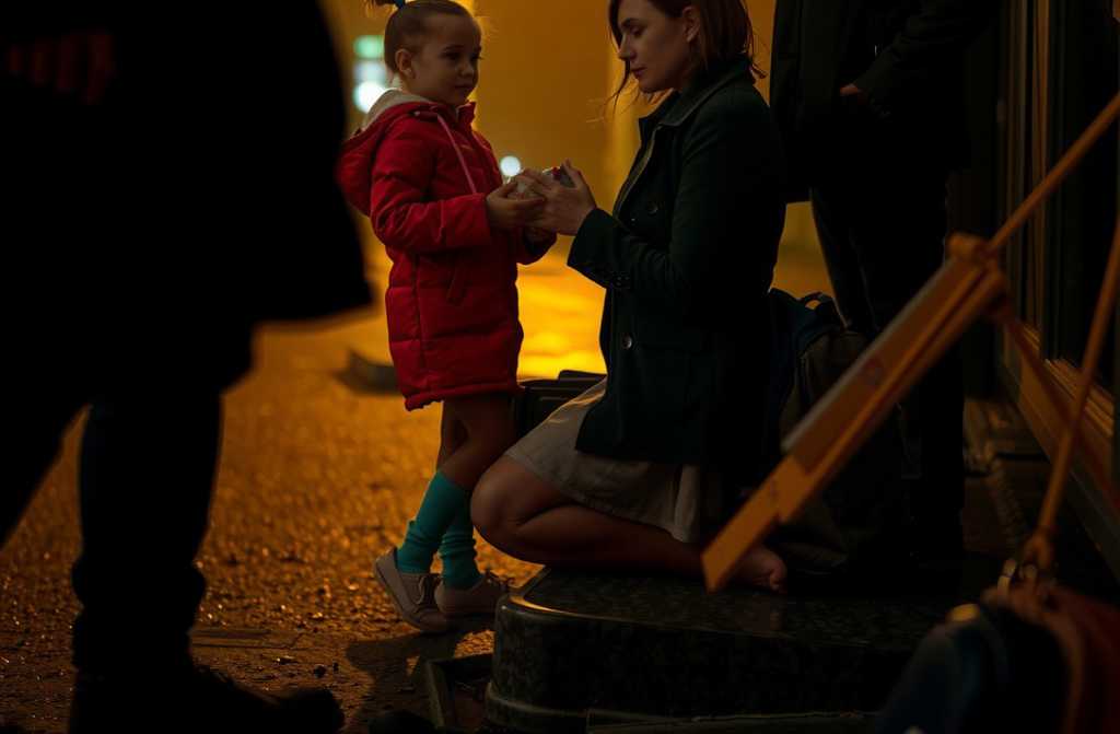 De repente, delante de ella se paró una niña de cuatro años, bien abrigada con un abrigo rojo y un pequeño paquete de papel en las manos.