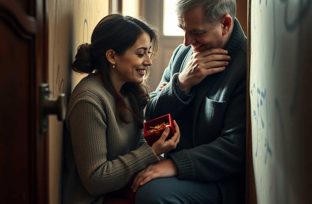 Yo chocqué con una caja de cartón y su contenido se esparció por el suelo. Mientras seguía refunfuñando y recogía los libros, ella levantó del linóleo una pequeña caja de terciopelo. La abrió un poco.