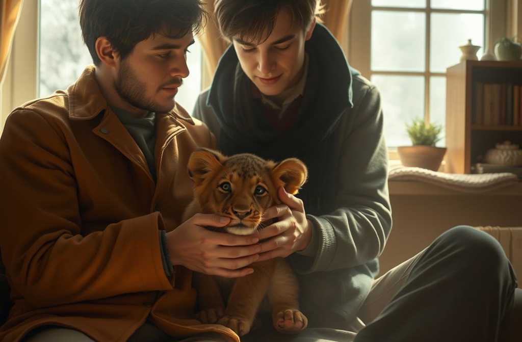 Un día, paseando, dieron con una tienda de animales exóticos. En el escaparate había pájaros, monos y reptiles, pero su mirada se clavó en una pequeña jaula donde yacía un cachorro de león. No era mucho más grande que un gatito, con unos ojos tristes y profundos que parecían comprenderlo todo.